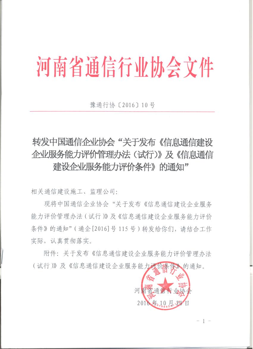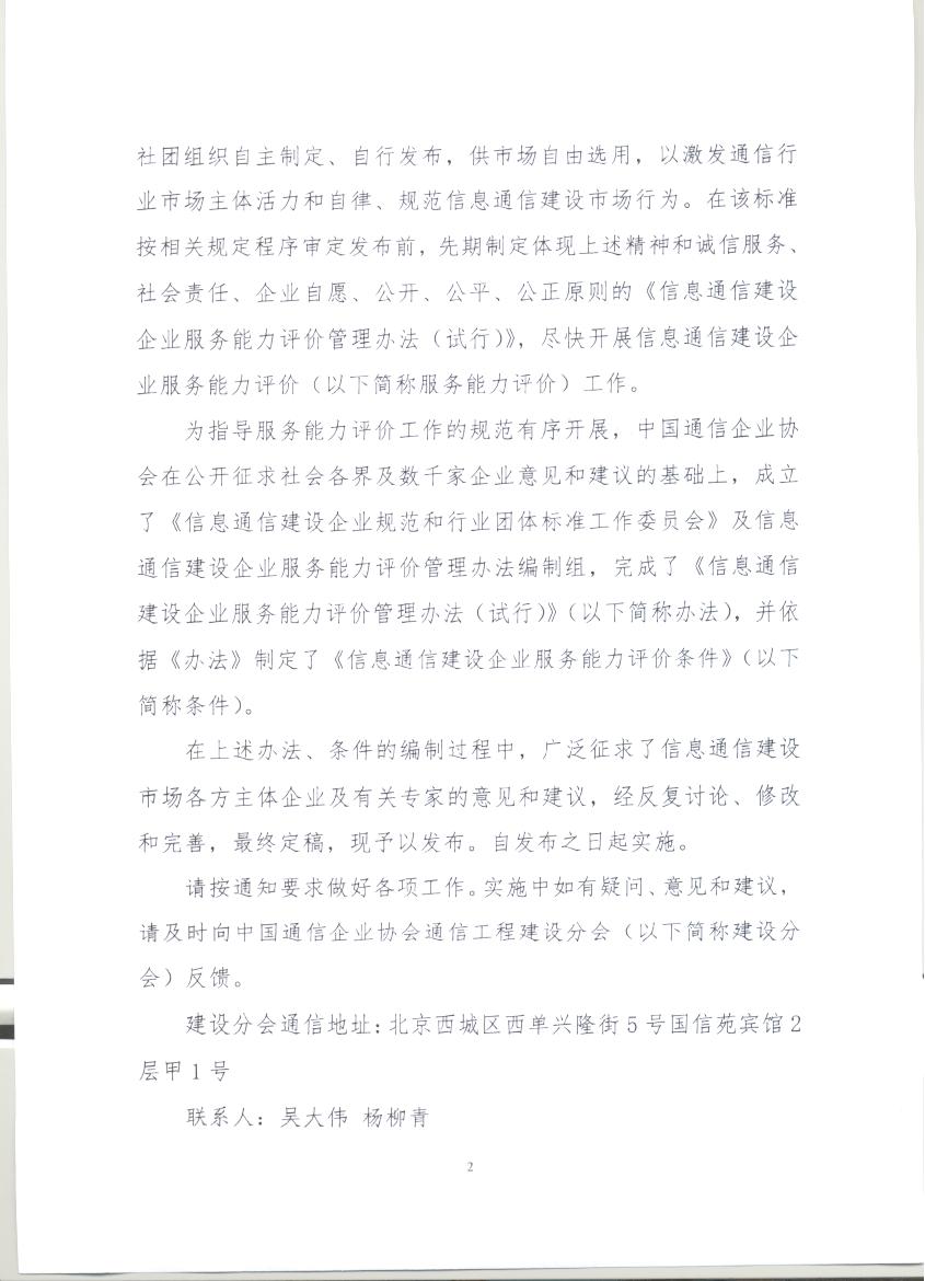 轉(zhuǎn)發(fā)中國(guó)通信企業(yè)協(xié)會(huì)“關(guān)于發(fā)布《信息通信建設(shè)企業(yè)服務(wù)能力評(píng)價(jià)管理辦法(試行)》及《信息通信建設(shè)企業(yè)服務(wù)能力評(píng)價(jià)條件》的通知”