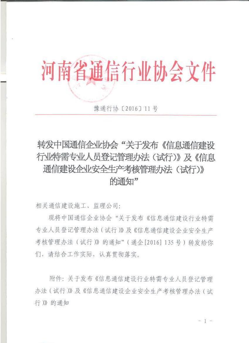 轉(zhuǎn)發(fā)中國通信企業(yè)協(xié)會“關(guān)于發(fā)布《信息通信建設(shè)行業(yè)特需專業(yè)人員登記管理辦法(試行)》及《信息通信建設(shè)企業(yè)安全生產(chǎn)考核管理辦法(試行)》 的通知”