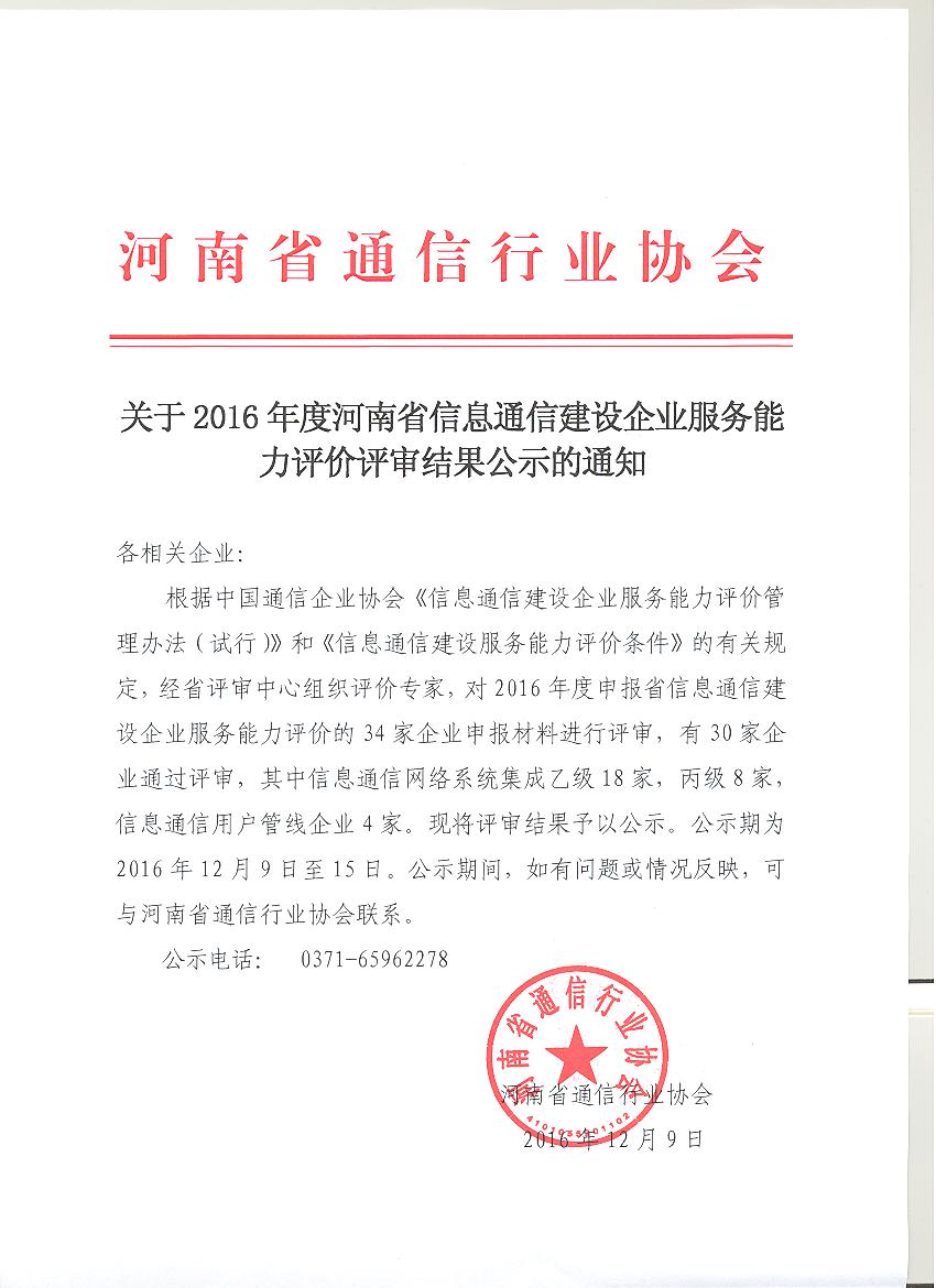 關(guān)于2016年度河南省信息通信建設(shè)企業(yè)服務(wù)能力評價(jià)評審結(jié)果公示的通知
