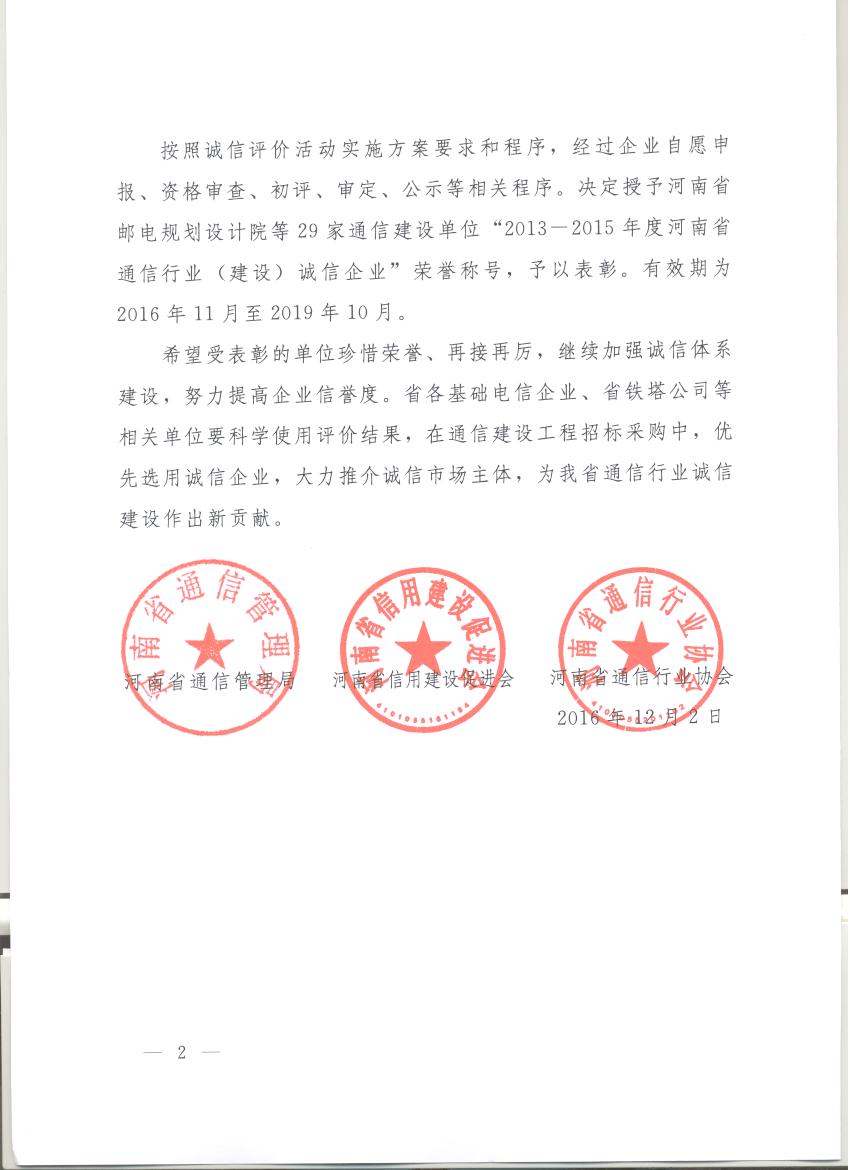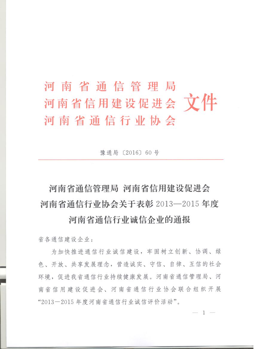 河南省通信管理局 河南省信用建設促進會 河南省通信行業(yè)協(xié)會關于表彰2013—2015年度河南省通信行業(yè)誠信企業(yè)的通報