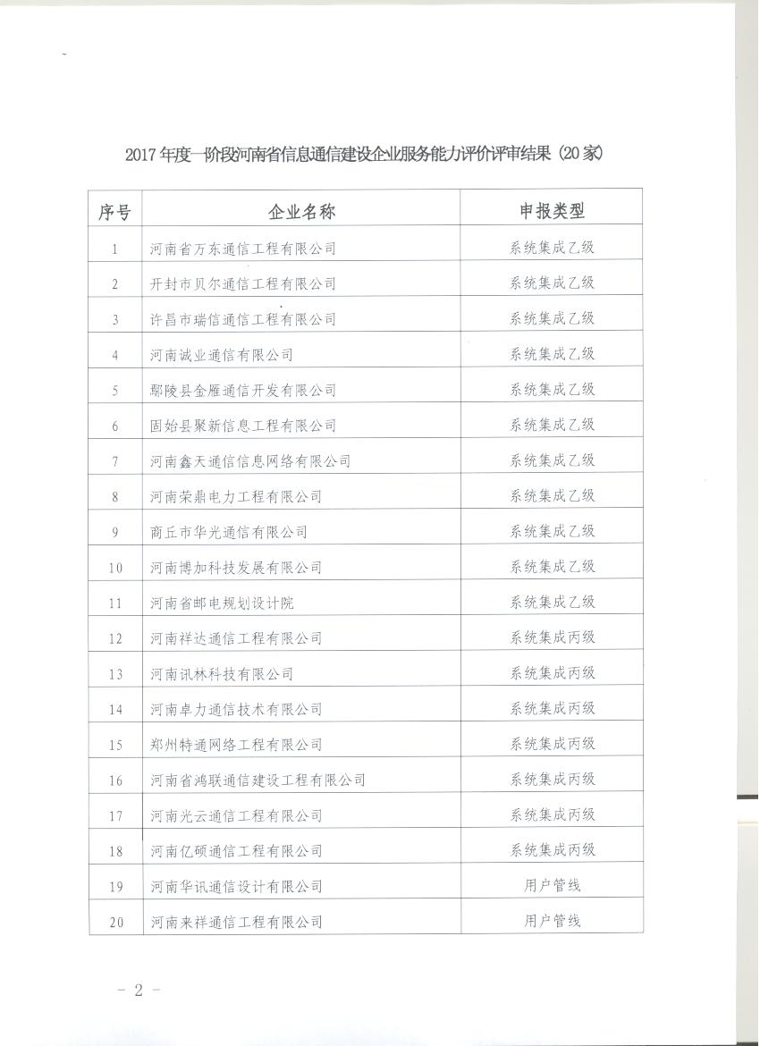 關于2017年度一階段河南省信息通信建設企業(yè)服務能力評價評審結果公示的通知