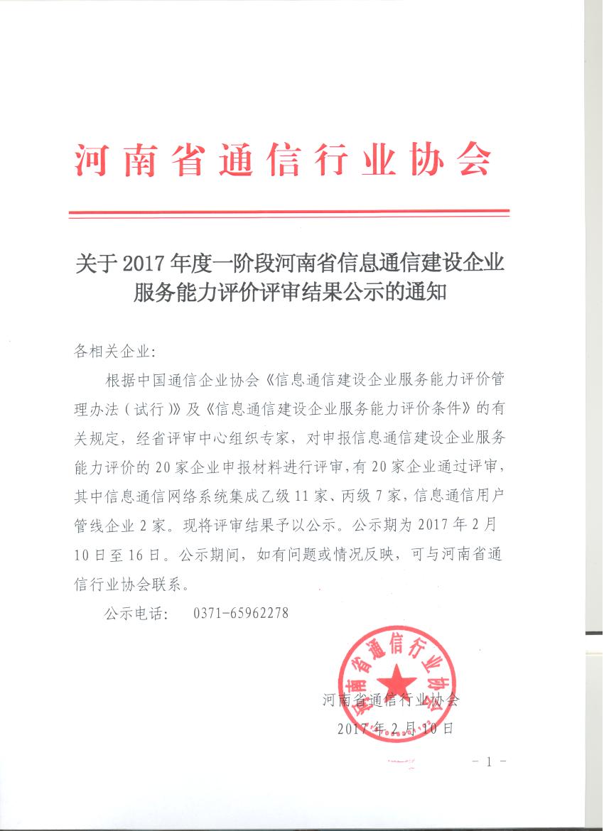關(guān)于2017年度一階段河南省信息通信建設(shè)企業(yè)服務(wù)能力評(píng)價(jià)評(píng)審結(jié)果公示的通知