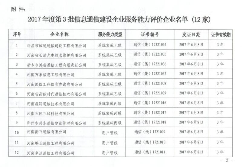 關(guān)于公布2017年第3批信息通信建設(shè)企業(yè)服務(wù)能力評價企業(yè)名單的通告