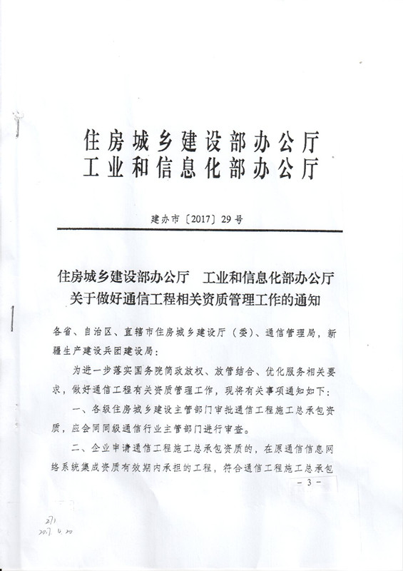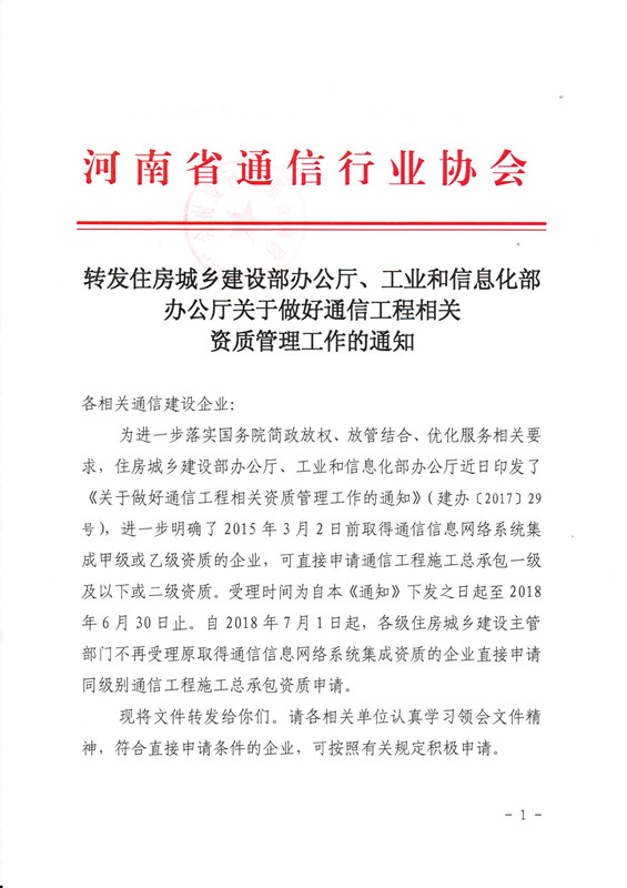 轉(zhuǎn)發(fā)住房城鄉(xiāng)建設(shè)部辦公廳、工業(yè)和信息化部辦公廳關(guān)于做好通信工程相關(guān) 資質(zhì)管理工作的通知
