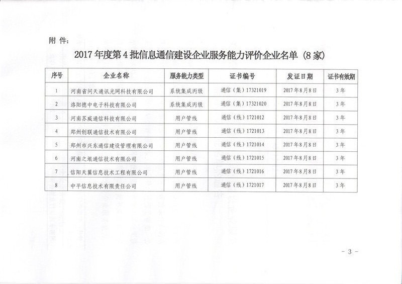 關(guān)于2017年第4批信息通信建設(shè)企業(yè)服務(wù)能力評價評審結(jié)果