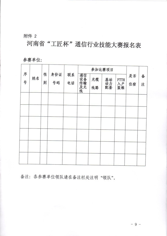 附件2:河南省“工匠杯”通信行業(yè)技能大賽報名表