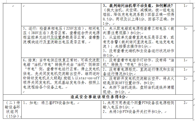 賽場準備材料清單:發(fā)電機及機油、燃油、發(fā)電引線、絕緣手套、電筆、萬用表、鉗形表、電工膠布、十字螺絲刀(大、?。?、活動板手、套筒、老虎鉗、尖嘴鉗、斜口鉗、美工刀、扎帶、已充電連接成組的基站蓄電池24塊(含3塊落后蓄電池),兩個有故障的模塊,兩個正常的模塊等。