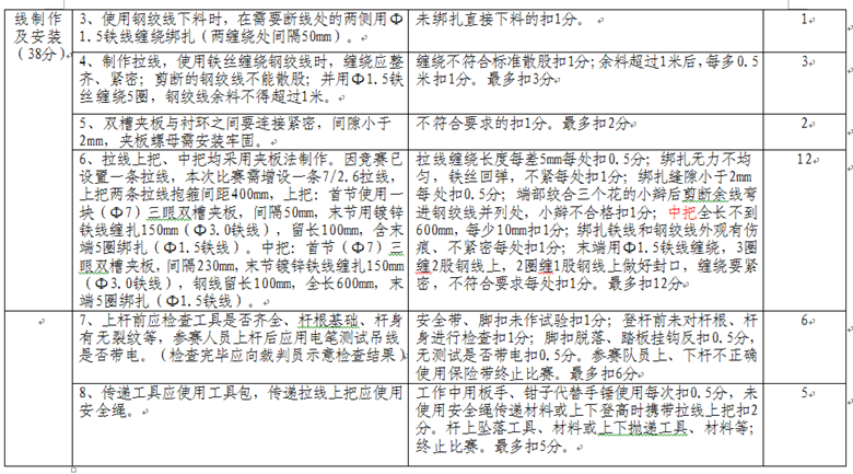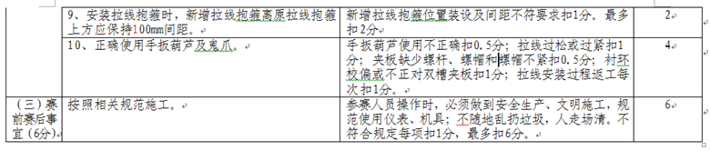 6、拉線安裝時,上桿前應檢查工具是否齊全、桿根基礎、桿身有無裂紋等,上桿后應用電筆測試吊線是否帶電。(檢查完畢應向裁判員示意檢查結(jié)果)。傳遞工具應使用工具包,傳遞拉線上把應使用安全繩。安裝拉線抱箍時,新增拉線抱箍離原拉線抱箍上方應保持100毫米間距。正確使用手扳葫蘆及鬼爪。桿上作業(yè)時,禁止上下投擲工具及材料料具。