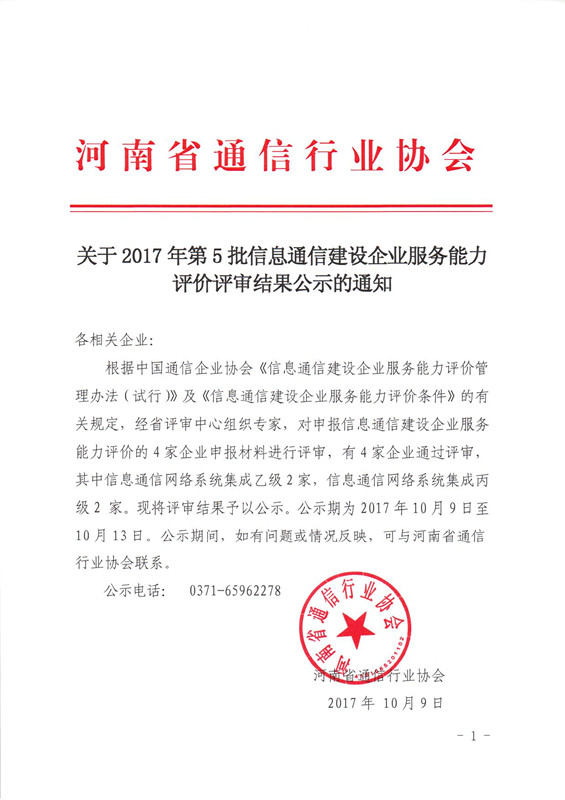 關(guān)于2017年第5批信息通信建設(shè)企業(yè)服務(wù)能力評價(jià)評審結(jié)果公示的通知