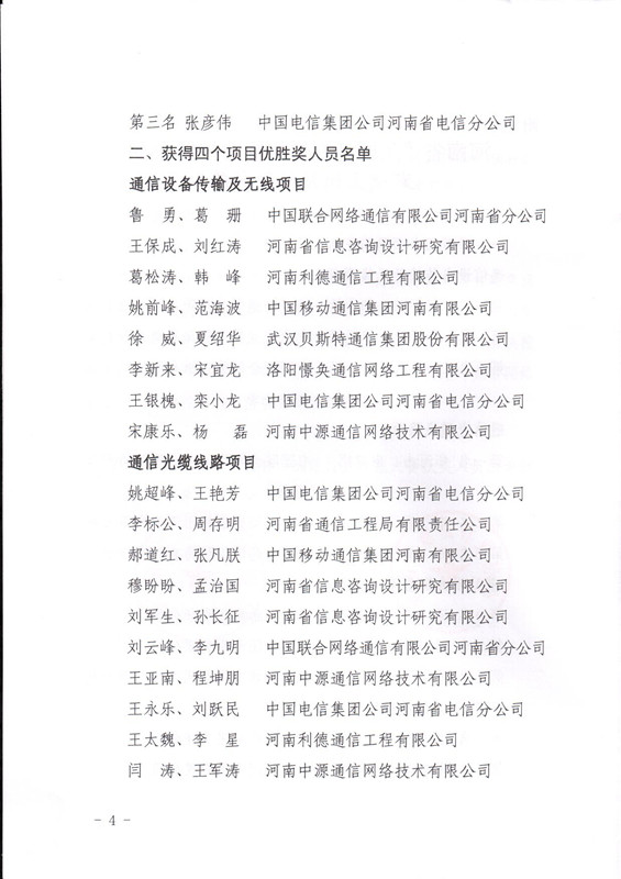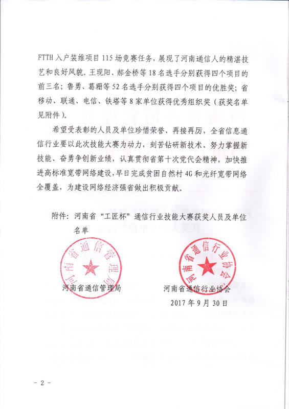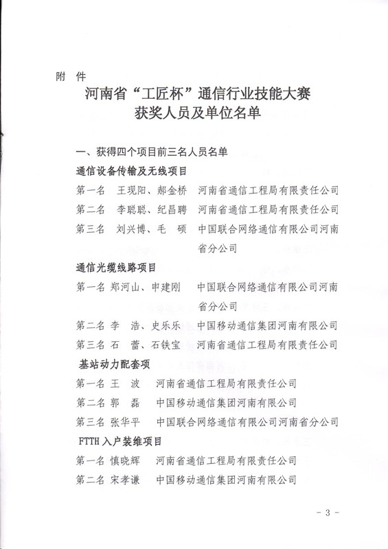 關(guān)于表彰河南省“工匠杯”通信行業(yè)技能大賽獲獎(jiǎng)人員及單位的通報(bào)