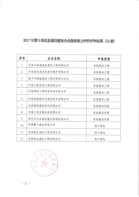 關(guān)于公布2017年第2批信息通信建設企業(yè)服務能力評價企業(yè)