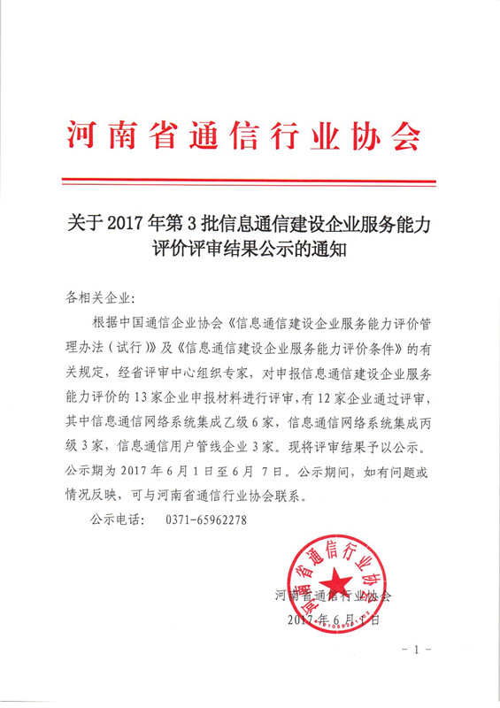 關(guān)于2017年第3批信息通信建設企業(yè)服務能力評價評審結(jié)果公示的通知
