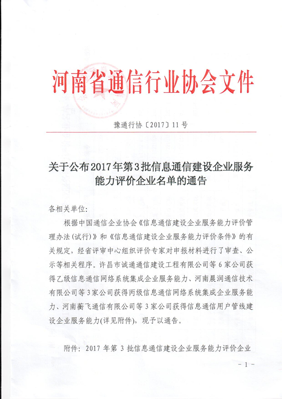 關(guān)于公布2017年第3批信息通信建設(shè)企業(yè)服務(wù)能力評價(jià)企業(yè)名單的通告
