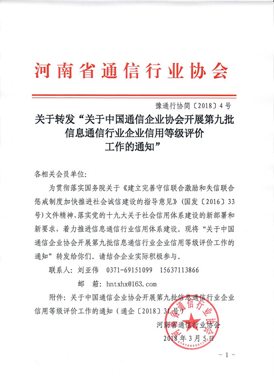 關(guān)于轉(zhuǎn)發(fā)“關(guān)于中國通信企業(yè)協(xié)會開展第九批信息通信行業(yè)企業(yè)信用等級評價工作的通知”