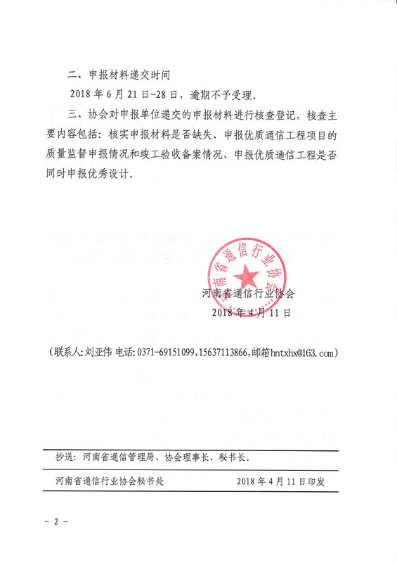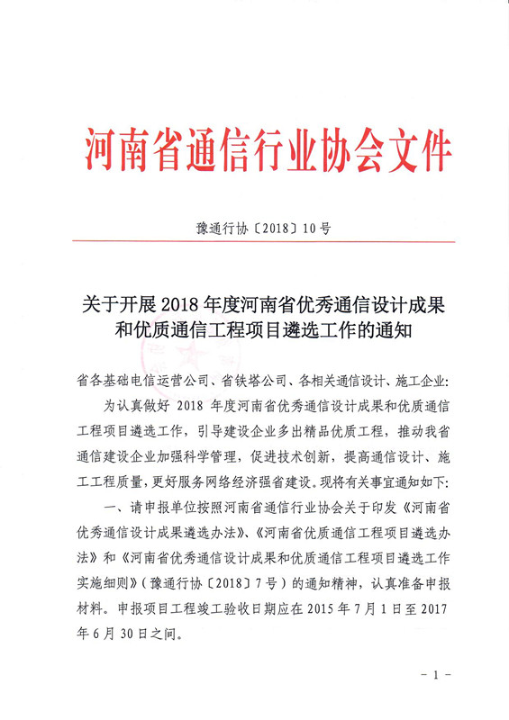 關(guān)于開展2018年度河南省優(yōu)秀通信設(shè)計(jì)成果和優(yōu)質(zhì)通信工程項(xiàng)目遴選工作的通知