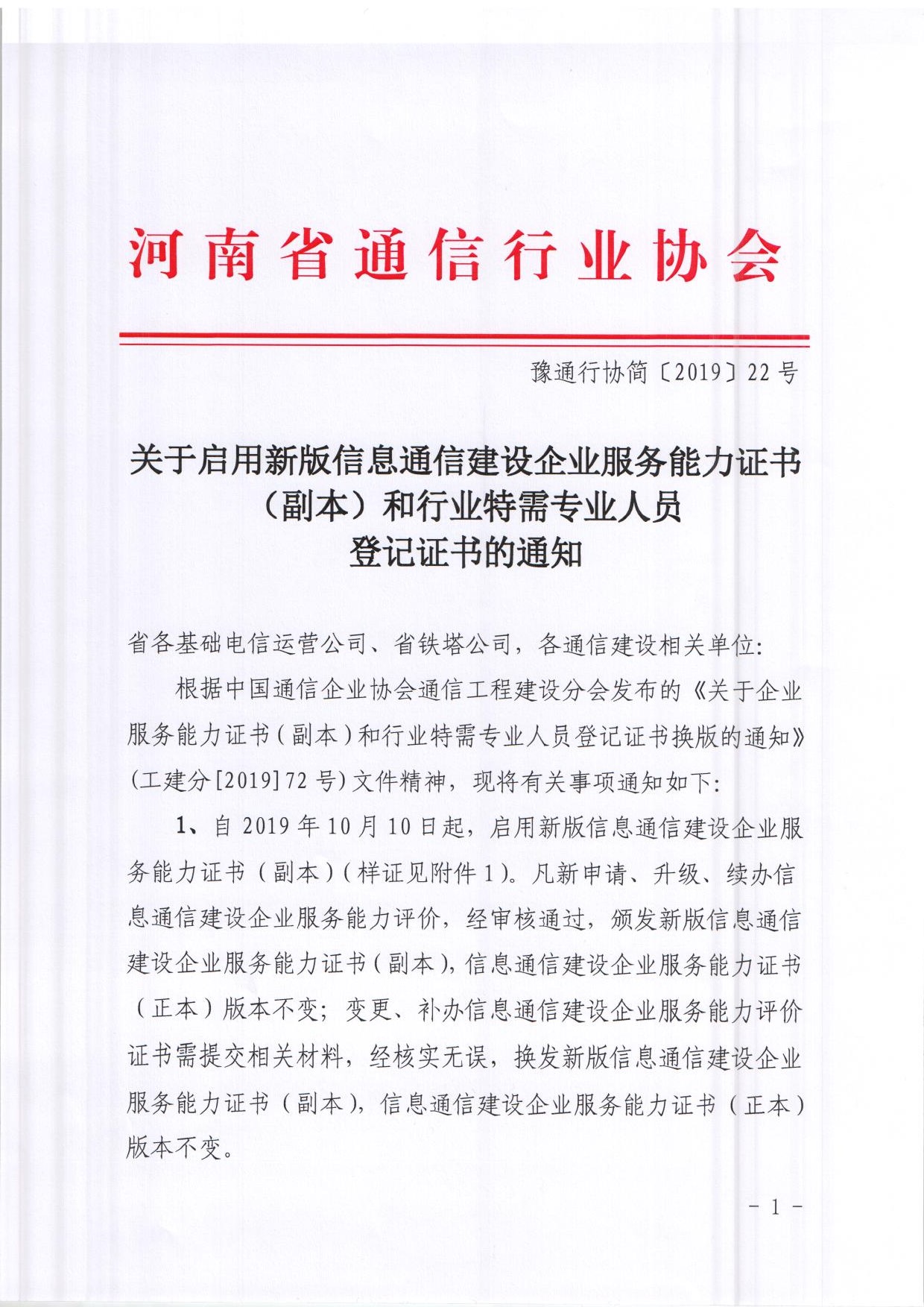 關于啟用新版信息通信建設企業(yè)服務能力證書(副本)和行業(yè)特需專業(yè)人員登記證書的通知
