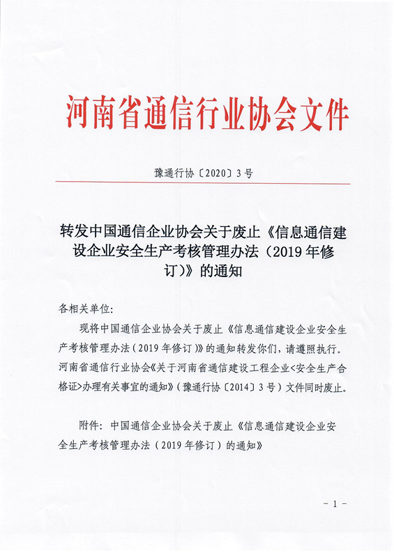 轉(zhuǎn)發(fā)中國通信企業(yè)協(xié)會關(guān)于廢止《信息通信建設(shè)企業(yè)安全生產(chǎn)考核管理辦法(2019年修訂)》的通知