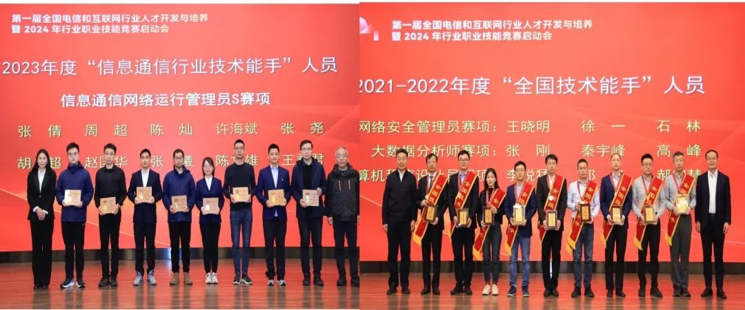 會(huì)上宣讀并表彰了2023年度第四屆全國(guó)電信和互聯(lián)網(wǎng)行業(yè)職業(yè)技能競(jìng)賽獲“信息通信行業(yè)技術(shù)能手”稱號(hào)人員和2021-2022年度全國(guó)行業(yè)職業(yè)技能競(jìng)賽獲“全國(guó)技術(shù)能手”稱號(hào)人員,來(lái)自中國(guó)電信股份有限公司安徽分公司陳燦、中國(guó)聯(lián)合網(wǎng)絡(luò)通信有限公司山東省分公司祁冬分別代表“行業(yè)技術(shù)能手”和“全國(guó)技術(shù)能手”發(fā)言。同期,會(huì)上舉辦了“第五屆全國(guó)電信和互聯(lián)網(wǎng)行業(yè)職業(yè)技能競(jìng)賽”啟動(dòng)儀式。