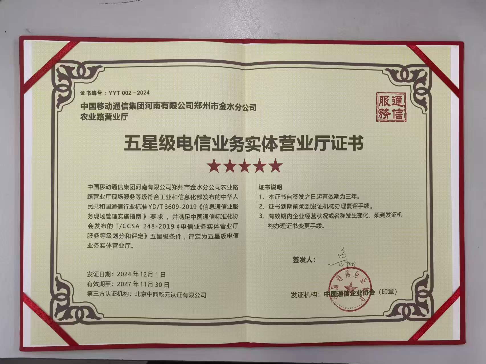 近日,在中國通信企業(yè)協(xié)會組織開展的2024年信息通信行業(yè)服務現(xiàn)場星級評定活動中,鄭州移動農業(yè)路營業(yè)廳榮獲全國“2024年信息通信行業(yè)五星級電信業(yè)務實體營業(yè)廳”稱號,是河南省通信行業(yè)唯一獲此殊榮的單位。在中國通信企業(yè)協(xié)會“線上申報+實地考察”的嚴格評審下,農業(yè)路營業(yè)廳脫穎而出,這一榮譽彰顯了該營業(yè)廳的綜合實力,是對其精益求精、踏實努力的高度肯定。
