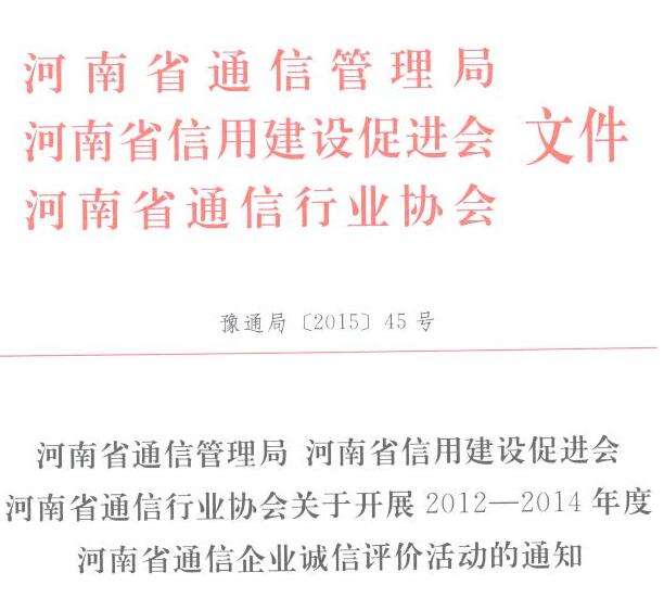 >> 河南省通信行業(yè)協(xié)會(huì)關(guān)于開(kāi)展2012-2014年度河南省通信企業(yè)誠(chéng)信評(píng)價(jià)活動(dòng)的通知
