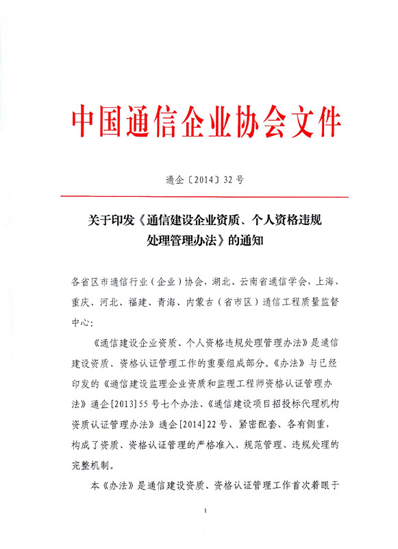 中國通信企業(yè)協(xié)會關(guān)于印發(fā)《通信建設(shè)企業(yè)資質(zhì)、個人資格違規(guī)處理管理辦法》的通知